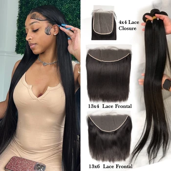 Straight Bundles Human Hair Extensions 30 40 Inch Pre Plucked Front Brazilian 4×4 13×4 13×6 Hd 3 Bundles With Closure Frontal